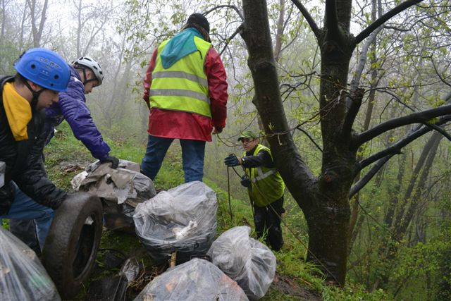Malgré le temps exécrable, le groupe de jeunes et les encadrants OSE (Estelle, Michel, Marie-Françoise) ont travaillé pendant plusieurs heures et réussi à remplir une benne de plusieurs tonnes de déchets sur les pentes de la D941 à Durtol et à Orcines.